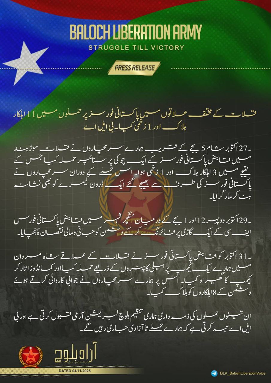 قلات کے مختلف علاقوں میں پاکستانی فورسز پر حملوں میں 11 اہلکار ہلاک اور 1 زخمی کیا۔ بی ایل اے۔