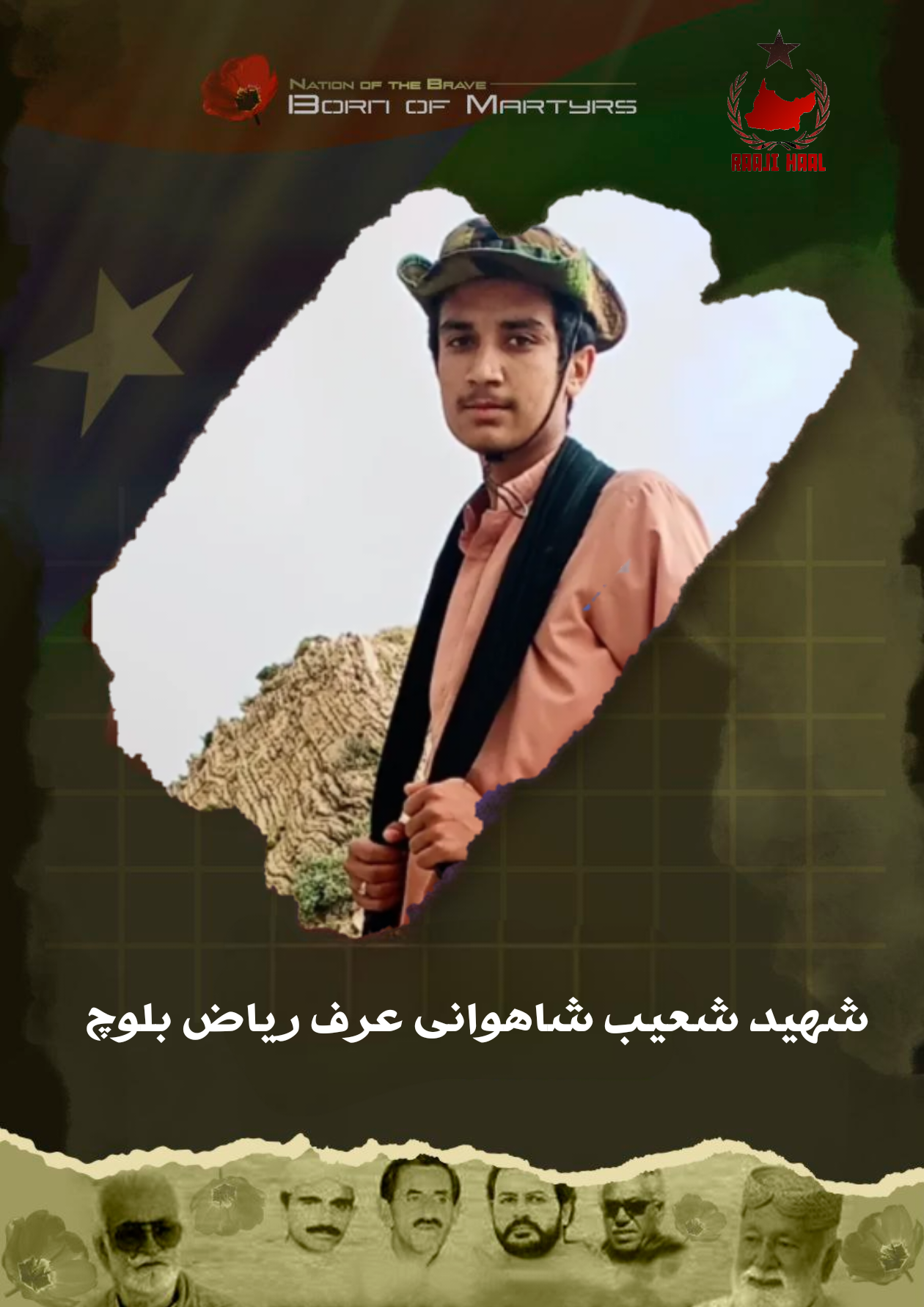نام: شہید شعیب شاہوانی عرف: ریاض بلوچ ولد: احمد علی شاہوانی علاقہ: سریاب چکی شاہوانی، کوئٹہ تاریخِ شہادت: 25 فروری 2024 مقامِ شہادت: کاہان