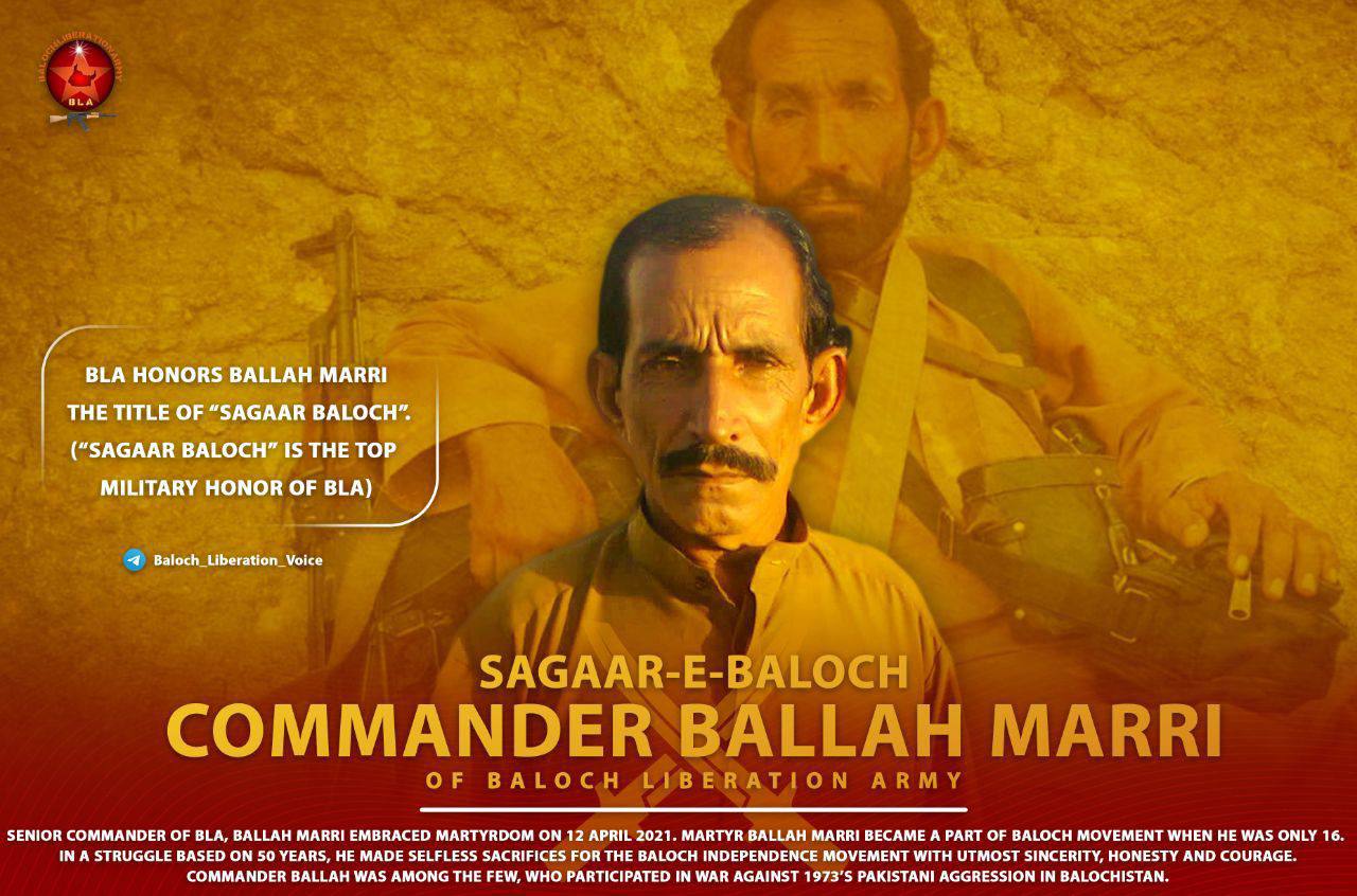 ان کی غیر معمولی خدمات کے اعتراف میں، بی ایل اے نے شہید بلا مری کو “سگار بلوچ” کے اعلیٰ ترین عسکری اعزاز سے نوازا — جو اس سے قبل صرف شہید امیر بخش لانگو اور شہید ماما مہندو مری کو دیا جا چکا تھا۔